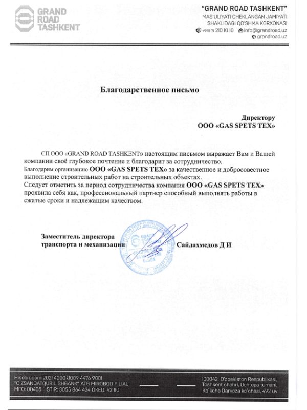 Вот уже 17 лет компания ООО «GAS SPETS TEX » осуществляет строительство и ремонт автомобильных дорог: строительство автомобильных дорог общего пользования по городу Ташкент и Ташкентской области. За этот немалый период компанией накоплен серьезный опыт в асфальтировании дорожного полотна.